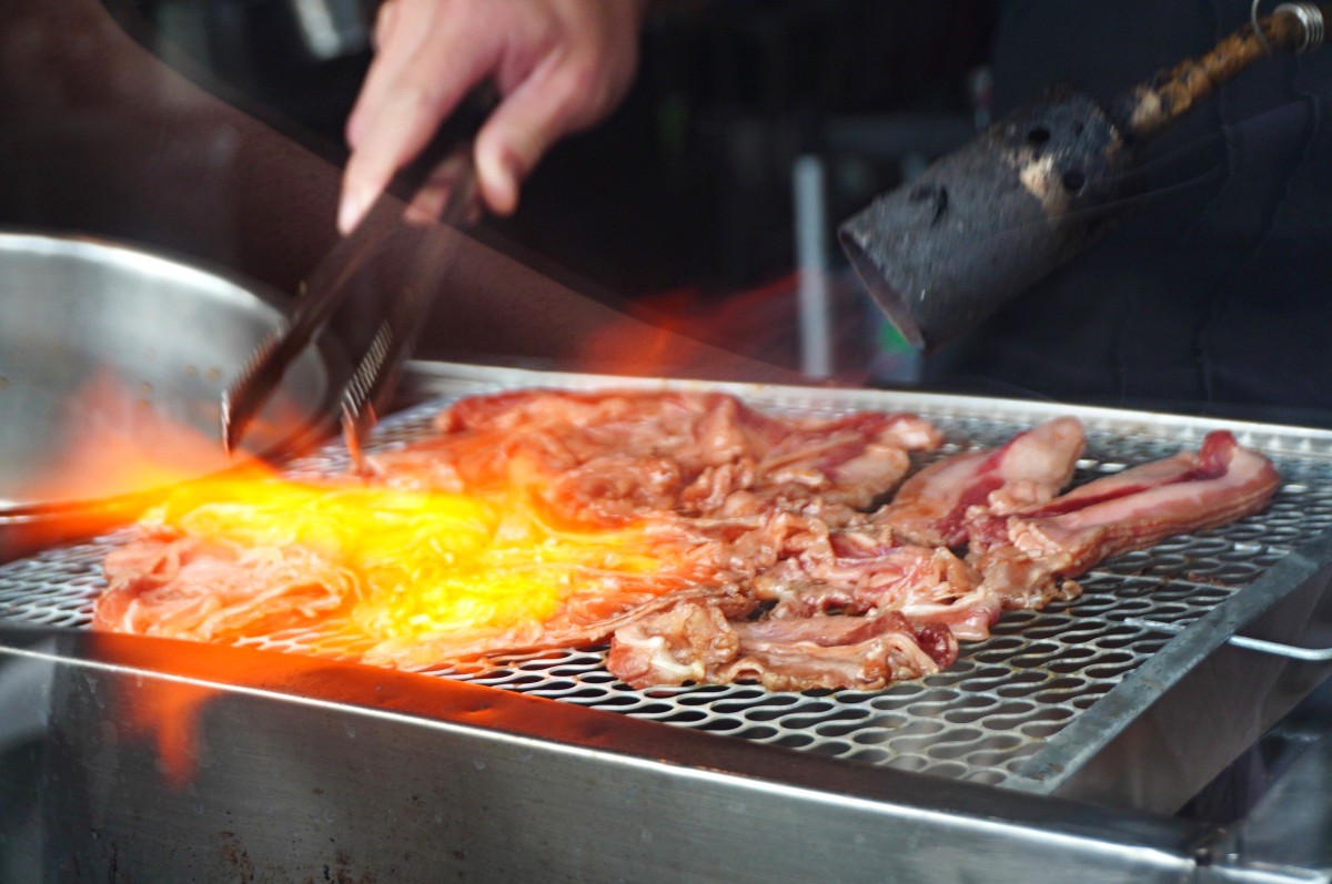 使用大型火槍炙燒直火炭燒真材實料