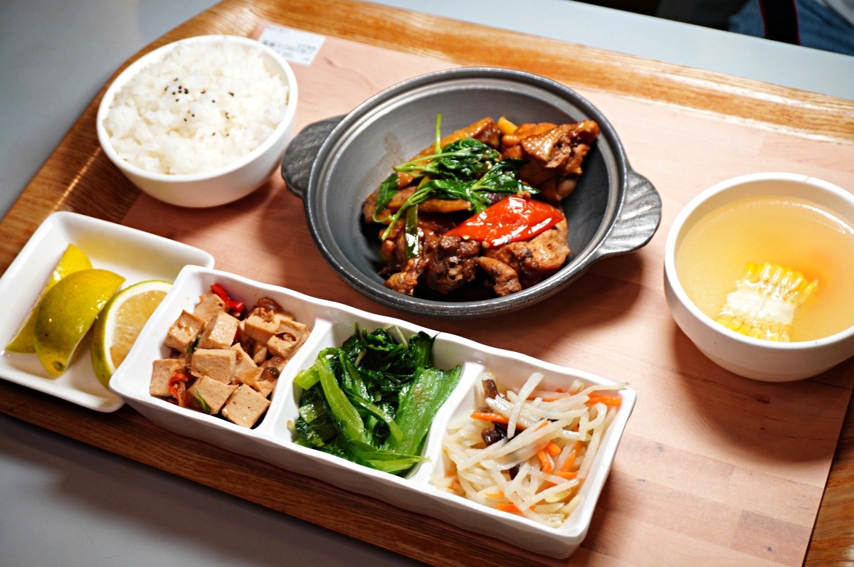 定食方式呈現的餐點 ,三杯土雞是店家自己養殖土雞,