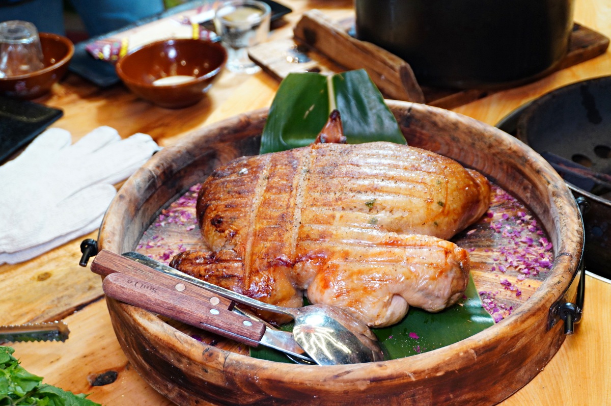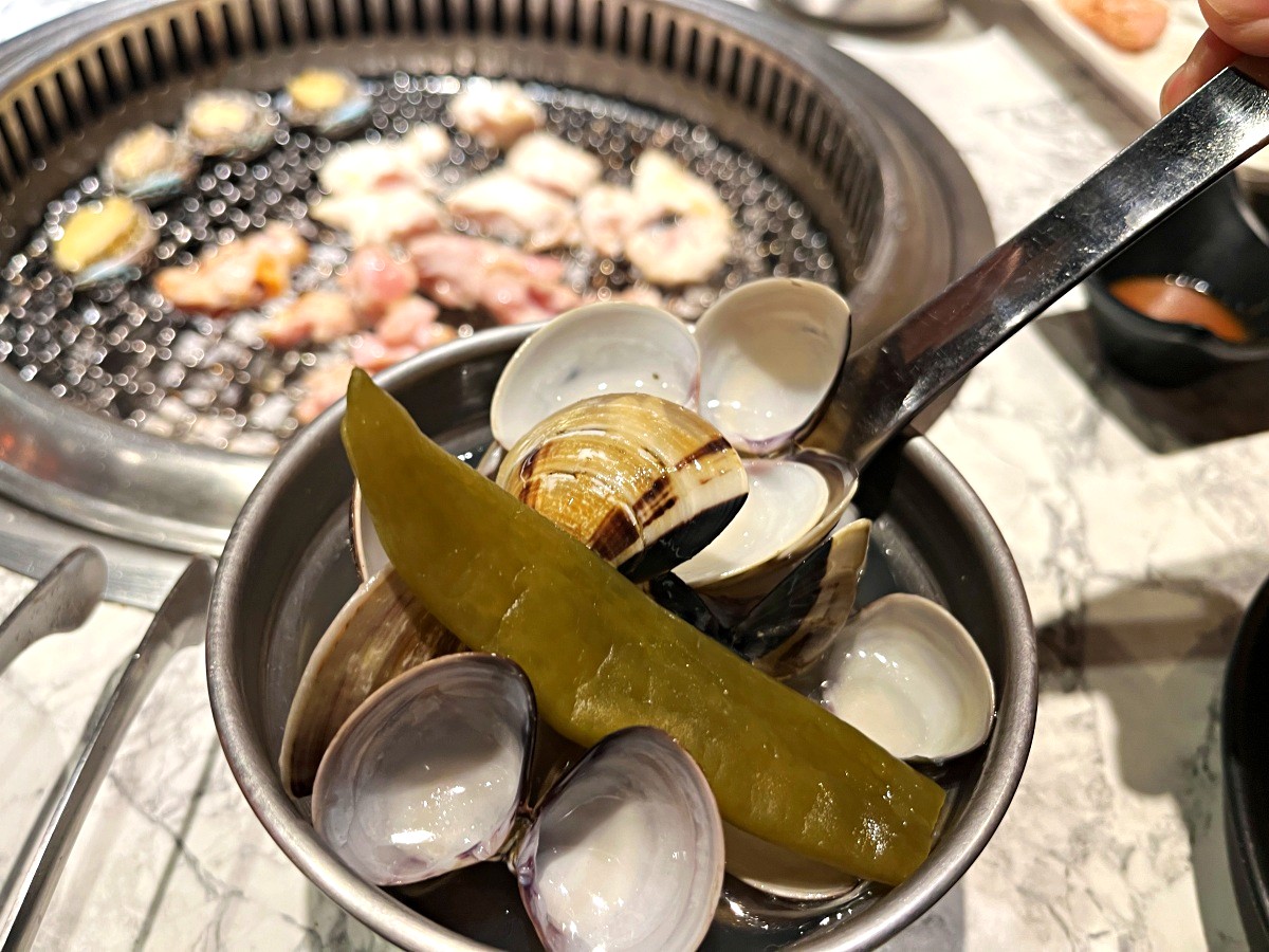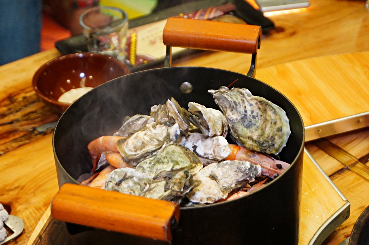 在桌邊直接把新鮮海鮮倒進超高溫的石頭鑄鐵鍋內蒸氣加熱